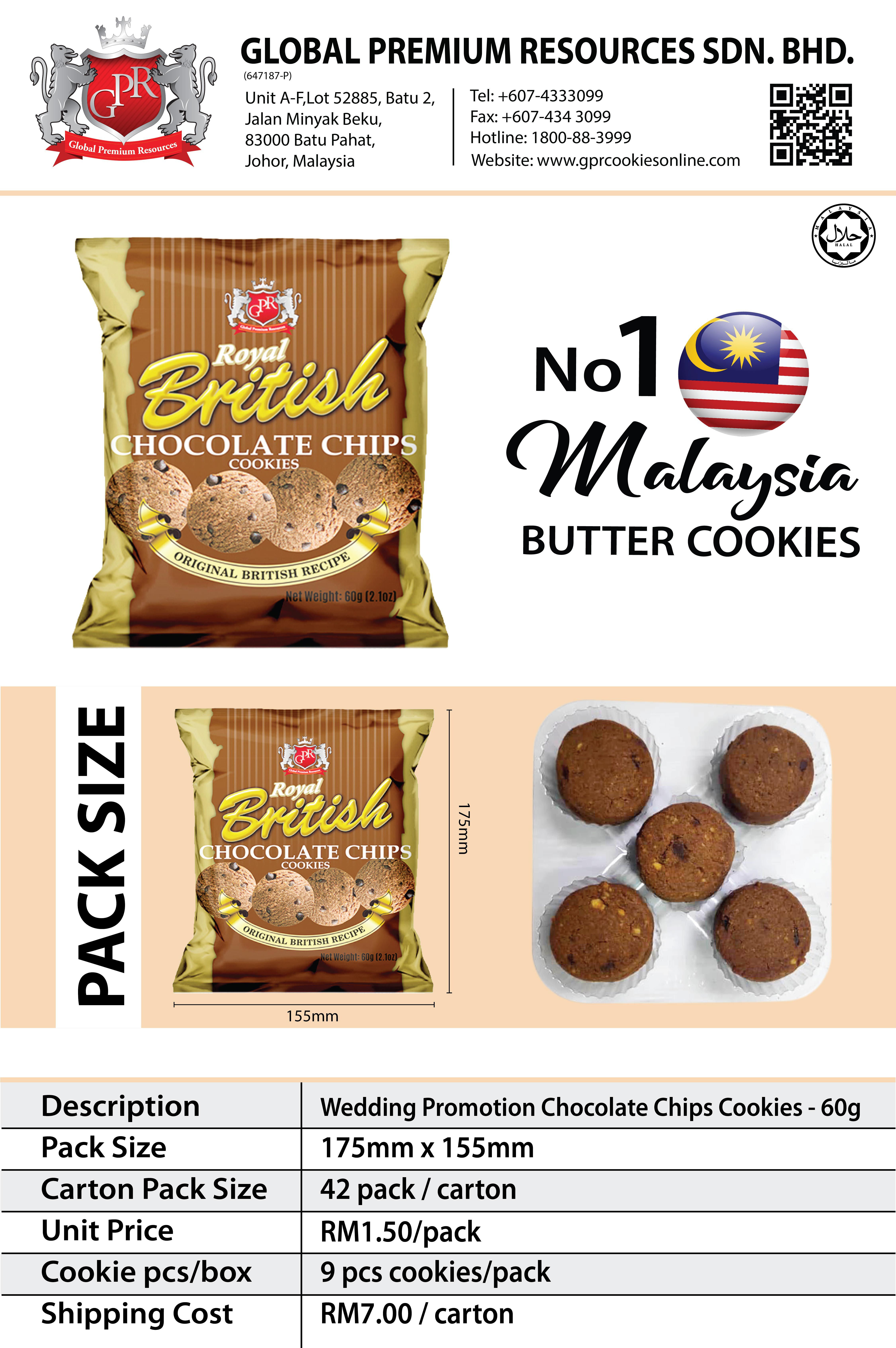 Wedding ( 3 WEEK PRE-ORDER ) GPR Royal British Chocolate Chips Cookies (60g x 42 Pcs) *Minimum 200pcs